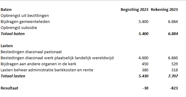 De verwachte bestedingen (begroting) sluiten als regel nauw aan bij de rekeningen over de voorgaande jaren. Het plaatselijk diaconale werk vertoont een grote mate van continuïteit: de predikanten of andere werkers verrichten hun werkzaamheden, kerkdiensten worden gehouden en ook andere kerkelijke activiteiten vinden plaats. In de kolom begroting in het overzicht onder H. is dit cijfermatig in beeld gebracht.